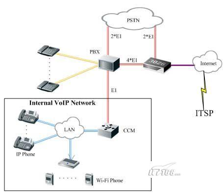 酒店申請(qǐng)了4條到CNC的E1線路,用于語音呼叫業(yè)務(wù),同時(shí)內(nèi)部還建設(shè)有覆蓋整個(gè)酒店的VoIP網(wǎng)絡(luò),通過CCM系統(tǒng)進(jìn)行集中管理,CCM系統(tǒng)與PBX之間通過E1線進(jìn)行連接。