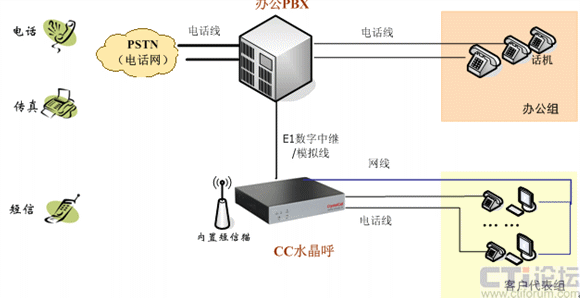 CC水晶呼支持與辦公PBX語音交換機融合組網,辦公PBX完成辦公語音交換的功能,CC水晶呼完成客戶服務的受理,組網說明如下: