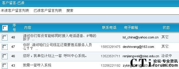 座席在CSR2000頁面可以查看到網(wǎng)站訪問者的流言,并可以作出標記:聯(lián)系成功、無法聯(lián)系、洽談中、達成交易/合作、未達成、其他等,如下圖所示: