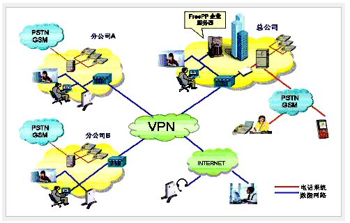 FreePP獨(dú)有的群組功能可以幫助企業(yè)將其總部與分支機(jī)構(gòu)原本各自獨(dú)立的若干個(gè)PBX整合成為一個(gè)PBX,實(shí)現(xiàn)Internet、PSTN網(wǎng)絡(luò)上通信應(yīng)用的融合,幫忙企業(yè)擺脫對(duì)傳統(tǒng)通信運(yùn)營(yíng)商的依賴,完全掌握自己的通信網(wǎng)絡(luò)。通過(guò)為PBX外線上的若干個(gè)FreePP Box (或MPES)分配一個(gè)Group Number,PBX內(nèi)線上的分機(jī)按照PBX上的設(shè)定來(lái)獲取Group Number中的一個(gè)FreePP Box,進(jìn)而通過(guò)這個(gè)FreePP Box來(lái)呼叫另外一組Group Number 連接的PBX分機(jī)號(hào)碼。他們相互間的通信完全基于Internet實(shí)現(xiàn),無(wú)需象傳統(tǒng)方式那樣交納通信費(fèi)用。