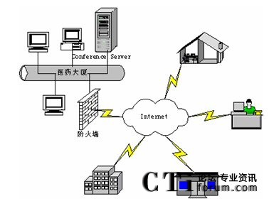 視頻會議服務器設置在上?偛,通過電信的6M帶寬接入互聯(lián)網(wǎng),并配備有廣域網(wǎng)靜態(tài)IP地址。下屬生產基地和分支機構通過電信ADSL接入和光纖接入等方式接入互聯(lián)網(wǎng)。這些點能夠實現(xiàn)網(wǎng)絡視頻會議通訊,進行音頻、視頻和數(shù)據(jù)的多方溝通。