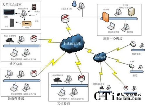 新時(shí)代證券公司下屬多個(gè)分支機(jī)構(gòu)。目前公司總部在北京,視頻會(huì)議服務(wù)器設(shè)置在上海原遠(yuǎn)東證券機(jī)房,通過(guò)電信的10M帶寬接入互聯(lián)網(wǎng),并配備有廣域網(wǎng)靜態(tài)IP地址。各地分支機(jī)構(gòu)和營(yíng)業(yè)部通過(guò)電信ADSL接入和光纖接入等方式接入互聯(lián)網(wǎng)。這些點(diǎn)能夠?qū)崿F(xiàn)網(wǎng)絡(luò)視頻會(huì)議通訊,進(jìn)行音頻、視頻和數(shù)據(jù)的多方溝通。