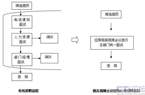 從上圖不難看出,通過應(yīng)用視高(Seegle)視頻會議系統(tǒng)進行招聘,能大大縮短流程和周期,免除了求職者一次次的來回奔波,方便異地進行面試。企業(yè)不僅可以在當(dāng)?shù)卣衅,更可以將招聘延伸到全國,甚至世界?br />