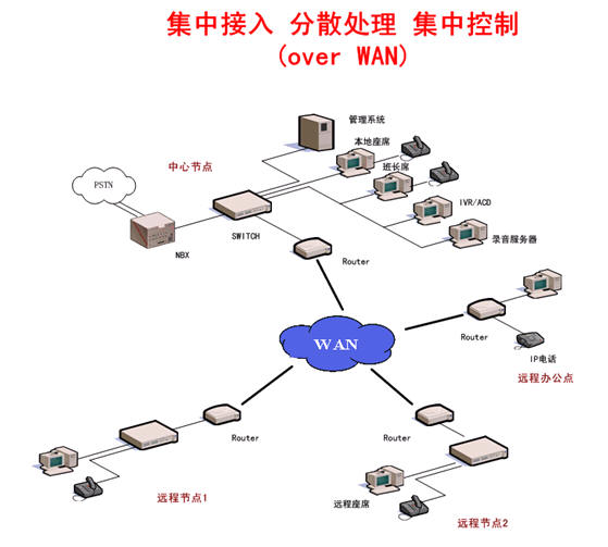VoIP 技術(shù)與呼叫中心的結(jié)合,不僅僅讓用戶享受到Internet帶來的大量話費的節(jié)約,更使基于Internet連接的分布式呼叫中心成為可能。分布式的呼叫中心系統(tǒng),集中式的管理,才能真正滿足那些擁有多個分支機(jī)構(gòu)的行業(yè)和企業(yè)用戶建設(shè)呼叫中心的需求;贗P分布式的NBX呼叫中心平臺支持遠(yuǎn)端坐席,利用現(xiàn)有的企業(yè)專線實現(xiàn)分布呼叫,同時簡化管理,由于人工坐席技能差異、語言差異、呼叫量的差異,以及客戶中心客戶所在地的變化及每個客戶對各自所擁有的用戶資料的保密性需求,分布式呼叫中心往往更適合各類企業(yè)的實際。分布式呼叫中心的建立,意味著需要在多個分中心之間進(jìn)行統(tǒng)一的呼叫控制及語音與同步數(shù)據(jù)轉(zhuǎn)移。NBX作為IP-PBX的引入,兩網(wǎng)合一的特性使分布式呼叫中心的建立成為了一件非常容易的事情。呼叫中心可以擴(kuò)展到多個位于不同地域的局域網(wǎng)上,通過路由選擇可以自動地把呼叫(語音)和數(shù)據(jù)從一個地點轉(zhuǎn)到另一個地點中心,因為語音數(shù)據(jù)通過同一網(wǎng)絡(luò),語音和數(shù)據(jù)同步轉(zhuǎn)移是很自然的。由于數(shù)據(jù)和語音全部通過以太網(wǎng)傳輸,所以不用支付昂貴的長途話費,降低了企業(yè)及客戶的開銷,同時由于各分支機(jī)構(gòu)可將各自的客戶資料保存在各分中心,這樣不僅大大降低了呼叫中心對數(shù)據(jù)庫的維護(hù)管理工作,也節(jié)約了設(shè)備投入及運營維護(hù)成本。