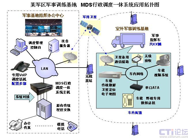 為了加強現(xiàn)代化軍隊的建設(shè),某軍區(qū)在其軍分區(qū)的指揮訓(xùn)練基地,使用先進(jìn)的技術(shù),搭建了一套由幾十輛軍事指揮車組成的作戰(zhàn)指揮訓(xùn)練系統(tǒng),其中的語音通信指揮系統(tǒng)部分,采用了美國Zed-3公司最先進(jìn)的基于IP技術(shù)的MDS80行政調(diào)度一體化通信系統(tǒng),解決了訓(xùn)練基地的指揮中心大樓的原有通信系統(tǒng),與室外的訓(xùn)練基地各輛指揮車之間,通過基地?zé)o線網(wǎng)絡(luò)及衛(wèi)星備份鏈路提供的IP通道,實現(xiàn)語音的指揮調(diào)度通信,達(dá)到訓(xùn)練基地要求的最佳的語音指揮調(diào)度通信效果。