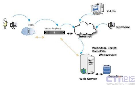 Voxeo Prophecy 是一個(gè)基于SIP、VoiceXML、CCXML標(biāo)準(zhǔn)的語音應(yīng)用開發(fā)和部署平臺,可以讓用戶快速高效的實(shí)施自己的IVR系統(tǒng)。大家都知道,傳統(tǒng)的IVR解決方案廠商,IVR系統(tǒng)架構(gòu)都是基于傳統(tǒng)的CTI硬件來實(shí)現(xiàn)的,無論是交換機(jī)方式還是語音卡方式,都是脫離不開硬件廠家的媒體資源。Voxeo Prophecy 是完全基于互聯(lián)網(wǎng)SIP 協(xié)議,同時(shí)也是VoiceXML標(biāo)準(zhǔn)的聯(lián)盟成員,不受任何硬件廠家的硬件限制。VoiceXML 是一種標(biāo)準(zhǔn)的標(biāo)記語言,用于建立語音界面,好比是我們所熟知的HTML 語言,Voxeo Prophecy 可以理解為傳統(tǒng)的語音瀏覽器,可以解釋VoiceXML 腳本并向用戶顯示語音信息,也可以接受用戶的語音請求,實(shí)現(xiàn)互動(dòng)。如下圖所示: