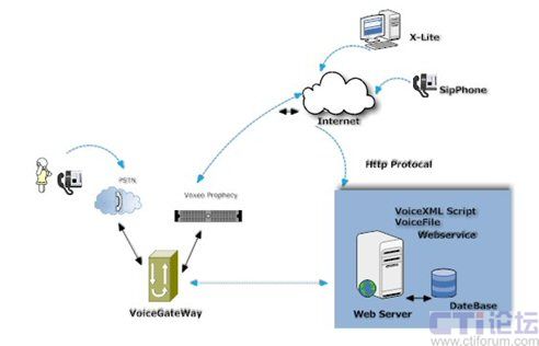 用戶首先通過固定電話或者手機(jī)傳統(tǒng)方式向Prophecy 提出請求,Prophecy我們可以理解為Voice Browser,使用者可以存取Internet