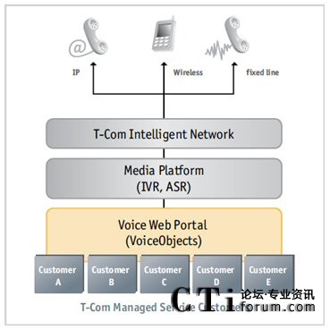 T-Com轉(zhuǎn)向VoiceObjects尋求一個(gè)可以管理成百上千應(yīng)用的解決方案,確保對(duì)客戶的高可用性和可靠性,并且?guī)椭3脂F(xiàn)有和未來的開發(fā)和更改成本在一個(gè)低水平上。在2004年初,T-Com引入了語(yǔ)音Web門戶,一個(gè)發(fā)揮了Web基礎(chǔ)架構(gòu)和立足于VoiceObjects服務(wù)器網(wǎng)絡(luò)版本的語(yǔ)音應(yīng)用服務(wù)平臺(tái)!拔覀冋趯ふ也粌H能幫助我們開發(fā),而且可以維護(hù)和管理我們的自服式電話應(yīng)用的解決方案,”Klindworth說:“當(dāng)時(shí)真的還沒有電話應(yīng)用服務(wù)器公司目錄,但這正是我們需要的:該產(chǎn)品是服務(wù)執(zhí)行平臺(tái),并且以Web應(yīng)用服務(wù)器的方式工作。我們發(fā)現(xiàn)它就是VoiceObjects!