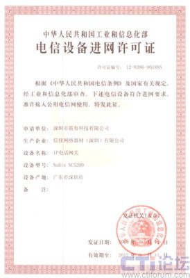 CTI論壇(ctiforum)05月15日消息: 日前從深圳市震有科技有限公司傳出消息,公司自主研發(fā)的NuBiz NC5200 IP電話網(wǎng)關(guān)設(shè)備順利通過工業(yè)和信息化部電信設(shè)備認(rèn)證中心的審核,取得“電信設(shè)備進(jìn)網(wǎng)許可證”。此舉標(biāo)志著震有科技的NuBiz交換產(chǎn)品已成功取得進(jìn)入國家電信網(wǎng)的資質(zhì),為大規(guī)模電信級(jí)推廣應(yīng)用打下了基礎(chǔ)。