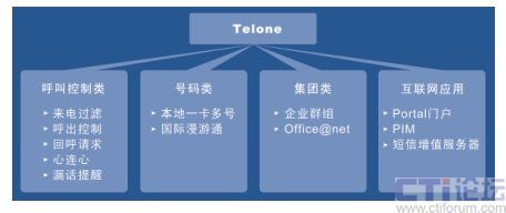 作為智能網(wǎng),Telone平臺(tái)可對(duì)外提供PPS(預(yù)付費(fèi)業(yè)務(wù))、移動(dòng)群組(M800)、被叫付費(fèi)(800)、來話過濾等業(yè)務(wù)、國(guó)際漫游通。