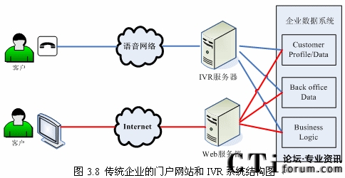 隨著Internet和Web技術(shù)的迅速發(fā)展,越來的企業(yè)開始建立自己的門戶網(wǎng)站,同時又擁有自己的IVR系統(tǒng)(如圖3.8所示),但是兩套系統(tǒng)完全獨(dú)立,語音系統(tǒng)和數(shù)據(jù)系統(tǒng)沒有任何交互或者只有很少的交互。而建立IVR系統(tǒng)的目標(biāo)就是給客戶更好的體驗(yàn),使客戶能方便的通過電話完成更多以前需要登陸企業(yè)門戶網(wǎng)站,或者親自去企業(yè)或其網(wǎng)點(diǎn)去辦理的業(yè)務(wù),這就需要IVR系統(tǒng)能跟后臺數(shù)據(jù)系統(tǒng)有更多更好的交互!罢Z音門戶”的概念出現(xiàn)也愈發(fā)的證明這一點(diǎn)。