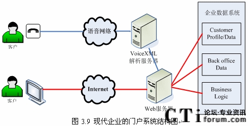 從另外一個方面,到目前為止,人們從Internet獲取各種資源時,還只能是借助計(jì)算機(jī)來實(shí)現(xiàn)[24]。而實(shí)際上,電話具有比計(jì)算機(jī)更高的普及率,如果允許人們通過電話來訪問Internet的資源,那么這對于Internet的應(yīng)用發(fā)展必將是一次質(zhì)的飛躍。在這類應(yīng)用前景的驅(qū)動下,VoiceXML使得用戶可以通過電話按鍵或語音來訪問Internet上的各種資源,它是語音瀏覽技術(shù)以及語音互聯(lián)網(wǎng)的核心。圖3.9描述了一個基于VoiceXML的現(xiàn)代企業(yè)語音門戶的系統(tǒng)結(jié)構(gòu)。