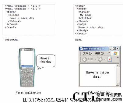 人們在Internet上瀏覽的網(wǎng)站是程序員們使用HTML(Hypertext Markup Language)開發(fā)的Web應(yīng)用程序,在這些網(wǎng)站上可以瀏覽到人們所需要的文字、圖片、視頻等信息。與這種方式類似,程序員可以開發(fā)基于VoiceXML的語音應(yīng)用程序,從而把用戶需要的信息以語音的方式提供給用戶。用戶可以通過手機(jī)或者電話等呼叫終端來訪問這類應(yīng)用程序得到他們想獲得信息。圖3.10顯示[25]了基于VoiceXML的語音應(yīng)用和基于HTML的Web應(yīng)用的相似和不同。