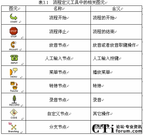 在用戶界面采用了圖形化的過程方式來定義IVR系統(tǒng)的流程,那么流程定義工具就需要向用戶提供一組抽象描述流程的基本設(shè)計(jì)控件,用戶通過使用這些基本控件來可視化的搭建IVR系統(tǒng)的流程。而基本設(shè)計(jì)控件的選擇就同整個系統(tǒng)所選擇的過程定義模型密切相關(guān),過程定義模型的一個重要的功能就是為建模用戶提供抽象描述實(shí)際業(yè)務(wù)處理過程所必須的設(shè)計(jì)元素。在設(shè)計(jì)本文所描述的IVR系統(tǒng)流程定義工具是,采用的是基于流程節(jié)點(diǎn)的過程定義模型,流程節(jié)點(diǎn)是整個IVR系統(tǒng)流程定義工具定義的唯一設(shè)計(jì)元素。因此,在用戶界面中,向用戶提供的是流程中所涉及到的各種流程節(jié)點(diǎn)控件,用戶通過在設(shè)計(jì)界面中添加以圖形表示的各種流程節(jié)點(diǎn)控件,填寫相應(yīng)的流程節(jié)點(diǎn)相關(guān)屬性信息,之后通過使用帶箭頭的連線來連接不同的流程節(jié)點(diǎn)來可視化的定義流轉(zhuǎn)順序。