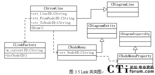每一個節(jié)點(diǎn)保存自己的唯一的節(jié)點(diǎn)名稱,由CArrowLine類來保存其關(guān)聯(lián)關(guān)系,因?yàn)閮蓚節(jié)點(diǎn)之間的關(guān)聯(lián)關(guān)系只有二向性,所以只需要保存一個 節(jié)點(diǎn)名稱和一個 節(jié)點(diǎn)名稱。類圖如圖3.5所示,CLinkFactory類的作用是一個獲取當(dāng)前節(jié)點(diǎn)名稱,CNodeMenu類是菜單(Menu) 節(jié)點(diǎn)類,繼承CDiagramEntity類。圖中只是以CNodeMenu類未代表來表示所有的節(jié)點(diǎn)類。