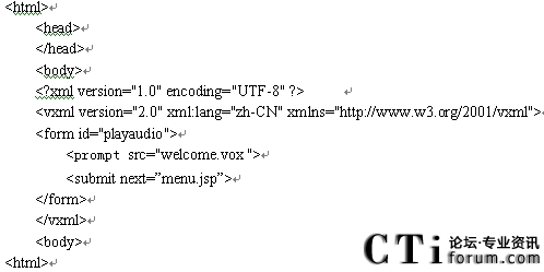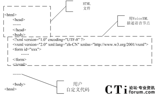 本文設(shè)計(jì)的IVR系統(tǒng)的流程文件是含有VoiceXML標(biāo)簽的Web文件,因此,首先,文件的基本框架必須符合HTML文件框架。而對語音節(jié)點(diǎn)的具體描述是通過某個VoiceXML標(biāo)簽或者某些具體標(biāo)簽的集合,其語法符合VoiceXML語音規(guī)范。與此同時,有編程經(jīng)驗(yàn)的用戶可以添加自定義代碼來定制一些具體Web數(shù)據(jù)操作,譬如,jsp或者asp的代碼。如圖3.6所示。