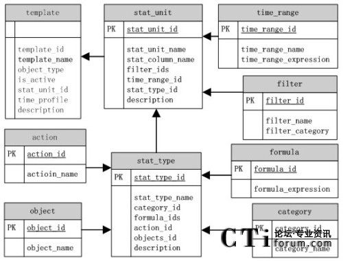 在模板配置存儲模型圖中,分別建立了單獨的表對模板劃分的每一個基本對象進行儲存。表template存儲模板的配置信息,stat_unit表存儲了統(tǒng)計項的基本信息,stat_type表是一些有關模板具體內容的配置。各表之間通過各自的ID標識號來進行關聯(lián)。不過一個模板可以包括多個統(tǒng)計單元,一個統(tǒng)計項可以包含多個過濾項,一個統(tǒng)計內容可以包含多個公式,這樣他們之間的ID關聯(lián)就成為1對多的關系。在這種情況下,父項中的ID關聯(lián)多個子項ID,其間是用逗號分隔。