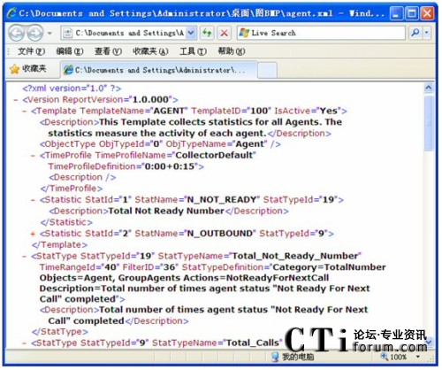 在模板導出的XML儲存圖中,ReportVersion屬性為報表系統(tǒng)的版本號。Template信息用來指定一個模板名字,給模板一個唯一的模板ID,再指定該模板是否激活,另外也為該模板添加了注釋。該例中是對所有坐席活動的數(shù)據(jù)進行統(tǒng)計。ObjectType為模板的統(tǒng)計類型,該模板中統(tǒng)計類型為坐席(Agent)。TimeProfile為設定收集的時間間隔,本例中為從每天的0點0分開始,每隔15分鐘收集一次。Statistic對應了一個統(tǒng)計內容配置,根據(jù)StatTypeID在下面將列出詳細內容。本例中StatTypeID為19,下面的StatType中將會根據(jù)StatTypeID與之相對應,其中配置了Category,
