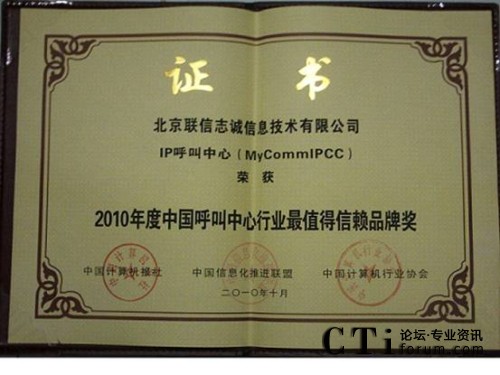 CTI論壇(ctiforum)11月1日消息(記者 潘婷婷):近日,在國(guó)家信息化專家咨詢委員會(huì)的指導(dǎo)下,作為中國(guó)信息化發(fā)展重要推動(dòng)力量的中國(guó)計(jì)算機(jī)報(bào)社、中國(guó)計(jì)算機(jī)行業(yè)協(xié)會(huì)、中國(guó)信息化推進(jìn)聯(lián)盟等國(guó)家級(jí)權(quán)威媒體及國(guó)家信息化領(lǐng)域一級(jí)權(quán)威機(jī)構(gòu),共同組織開展“2010中國(guó)行業(yè)信息化讀者選擇獎(jiǎng)評(píng)選”,重點(diǎn)展示信息化在行業(yè)應(yīng)用中的優(yōu)秀應(yīng)用案例、產(chǎn)品及解決方案。由中國(guó)計(jì)算機(jī)報(bào)社組織業(yè)內(nèi)專家,在經(jīng)過(guò)歷時(shí)3個(gè)月的產(chǎn)品征集、方案論證、專家評(píng)審后,北京聯(lián)信志誠(chéng)信息技術(shù)有限公司(簡(jiǎn)稱MyComm公司),其核心產(chǎn)品MyCommIPCC獨(dú)占2010年中國(guó)呼叫中心行業(yè)最值得信賴品牌獎(jiǎng)。