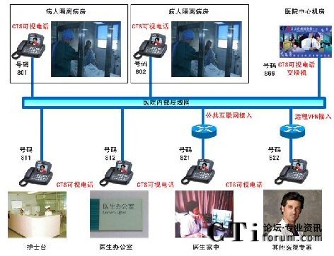 對于隔離病房的觀察,目前的實現可以使用遠程視頻監(jiān)控,或者使用電腦方式來遠程視頻交流。視頻監(jiān)控缺點無法實時與病人交流,使用電腦交流則操作比較繁瑣。CTS提出使用可視電話的方案來彌補當前的缺點:實時與病人交流,可視電話使用操作簡單。