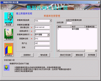 首先使用數(shù)據(jù)庫(kù)網(wǎng)關(guān)設(shè)計(jì)器定義數(shù)據(jù)庫(kù)配置,其中包括數(shù)據(jù)庫(kù)服務(wù)器的名稱和數(shù)據(jù)庫(kù)的登陸信息。該系統(tǒng)支持ODBC連接和ADO連接,支持的數(shù)據(jù)庫(kù)有ACCESS,SQL,MYSQL,ORACLE,SYBASE,配置方式如圖四所示。