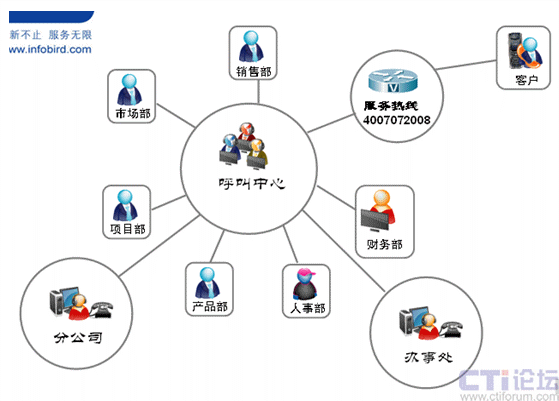 訊鳥軟件現(xiàn)有員工150人,總部位于北京,在上海設(shè)有一個分公司,在廣州、深圳分別設(shè)有一個辦事處。通過將呼叫中心與企業(yè)運(yùn)營管理的融合,大大提高了員工的工作效率,降低了運(yùn)營管理成本。訊鳥軟件副總裁姜冬良先生告訴我們,自2007年6月在企業(yè)運(yùn)營管理中加入呼叫中心之后,所有員工對外聯(lián)系的名片上只有公司的400號碼和員工分機(jī),不再顯示員工的手機(jī),這樣有效的避免了因?yàn)閱T工流失造成的客戶服務(wù)無法及時響應(yīng)的現(xiàn)象,同時,所有員工的工作狀態(tài)可以通過報(bào)表系統(tǒng)有效的衡量,尤其是銷售人員和分公司、辦事處人員的工作,管理層可以及時的檢查、監(jiān)督和糾正。