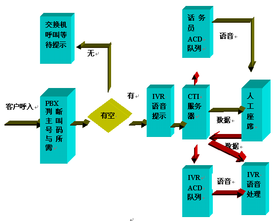 Server,CTI Server控制PBX執(zhí)行轉(zhuǎn)接任務(wù),呼叫進(jìn)入人工座席ACD隊(duì)列排隊(duì),如相關(guān)話務(wù)員有空閑,則執(zhí)行轉(zhuǎn)接操作。同時(shí)對于有些服務(wù),根據(jù)需要,CTI
