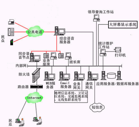 本系統(tǒng)物理結構由語音交換機、座席分流器、呼叫管理服務器(CTI服務器)、IVR(交互式語音應答)/IFR(交互式傳真應答、業(yè)務代表座席、調度席、統(tǒng)計維護管理工作站、數據庫/應用服務器、通信網關服務器、業(yè)務網關服務器、錄音工作站、領導查詢工作站、大屏幕顯示系統(tǒng)、網絡系統(tǒng)等構成。