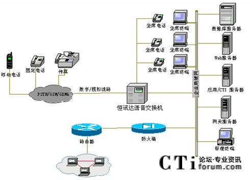 系統(tǒng)采用的硬件根據(jù)實際需求配置,如果實際接入電話容量小于30條線,系統(tǒng)與市話要采用普通模擬中繼線接入, 可選擇配置恒訊達公司HXD09的模擬板(AT0),申請的普通模擬中繼線需開通來電顯示業(yè)務,如電信部門不開通項服務,采用此種接入方式無法實現(xiàn)來電顯示功能;根據(jù)接入容量和話務員數(shù)量的總和計算卡的應用數(shù)量,如實際接入電話容量大于等于30條線,則可采用E1接口數(shù)字中繼線接入,