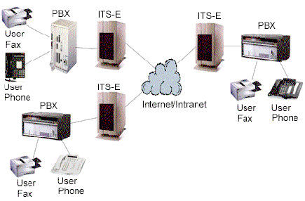 許多公司有多個(gè)辦公地點(diǎn),各地之間有著頻繁的通訊往來,電話和傳真。典型地,通訊涉及到公用交換電話網(wǎng)(PSTN)或PBX間的私人連接路線。Internet電話服務(wù)器(ITS-E)提供了另一選擇。基本原理是一處用戶撥打的電話經(jīng)本地PBX路由到本地ITS-E,本地ITS-E通過IP網(wǎng)絡(luò)送到目的地ITS-E,目的地ITS-E再將電話送到目的地PBX上,最后送到目的地電話或傳真機(jī)上。