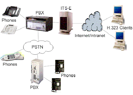 計(jì)算機(jī)IP電話產(chǎn)品,類似網(wǎng)絡(luò)會(huì)議系統(tǒng),允許用戶使用他們當(dāng)前的IP聯(lián)接把通話接到電腦上去(如通過以太網(wǎng)聯(lián)接到他們的局域網(wǎng)中)。這種作法的局限是PC用戶只可以與另一PC用戶通話。然而,使用ITS-E,這種局限將不存在。任何在網(wǎng)絡(luò)上的PC可使用H.323(用于IP電話上的ITU-T標(biāo)準(zhǔn))軟件包來實(shí)現(xiàn)通話,如微軟的網(wǎng)絡(luò)會(huì)議系統(tǒng),通過ITS-E服務(wù)器通至一個(gè)常規(guī)的電話使用者。電話用戶不需要任何新的裝備,甚至不會(huì)意識(shí)到聲音是從PC機(jī)中傳出及在IP網(wǎng)絡(luò)中傳輸。示意圖如下: