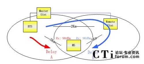 需要考慮GRRU站時延的引入對系統(tǒng)造成的影響?赡艽嬖诟采w區(qū)與施主扇區(qū)覆蓋區(qū)重疊的可能,如果兩重疊信號時延差小于4TA則不會造成任何問題,這是GSM規(guī)范規(guī)定的。當(dāng)兩信號時延差大于4TA且信號強度相當(dāng)(差值小于10dB)則將導(dǎo)致手機掉話;因此,這時需要考慮選取背向光纖直放站覆蓋區(qū)的施主扇區(qū),這樣基站重疊區(qū)和直放站重疊區(qū)就不會產(chǎn)生多徑引起的掉話了,而是兩個扇區(qū)信號的切換。