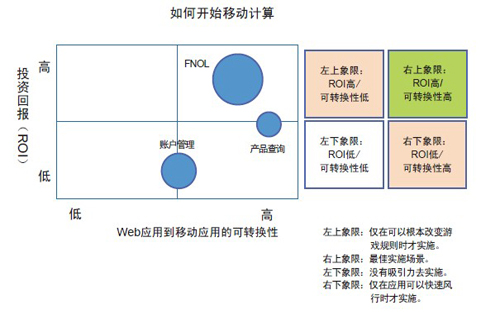 建議考察兩個基本維度:(1)第一個移動項目的總投資回報(ROI)和價值主張是什么?(2)現(xiàn)有的Web應用如何通過相對較少的努力就可以轉(zhuǎn)變成移動應用?在下面的圖表中這兩個維度被標為X軸和Y軸。氣泡的大小代表投入的大小。很顯然,右上方的象限是容易摘取的果子。您選擇哪個氣泡關(guān)鍵在于您對風險的偏好以及在市場中成為領先者的渴望。