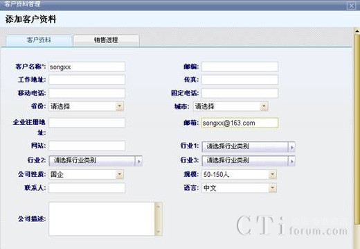 對(duì)新添加的客戶錄入客戶信息資料,包括客戶的名稱、郵箱等,為其建立起一個(gè)新的客戶關(guān)系,可以隨時(shí)找到該客戶的具體信息以及他的銷售情況,方便對(duì)客戶銷售進(jìn)程有一個(gè)充分地實(shí)時(shí)跟蹤,并為之更好地服務(wù)。