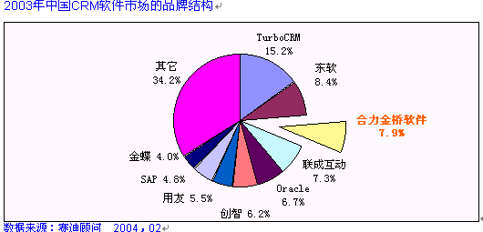 2004年2月10日,北京。賽迪顧問(CCID Consulting )在中國大飯店隆重舉辦了"2004IT市場年會", 會上發(fā)布了《2003-2004年中國管理軟件產業(yè)投資機會研究年度報告》。HOLLYCRM(合力金橋軟件)公司在強手如林的評選中憑借其強勁的市場占有份額、深厚的品牌實力及出眾的用戶美譽度無可爭議地穩(wěn)居2003年度中國CRM軟件整體市場份額前三甲, 同時更奪得了2003年度中國電信行業(yè)CRM市場份額龍頭位置。