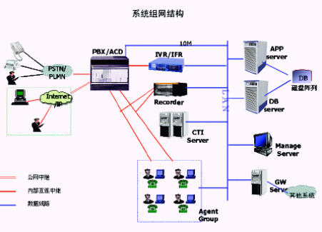 針對大型呼叫中心需求,可以推薦采用傳統(tǒng)PBX平臺呼叫中心解決方案。基本系統(tǒng)組網(wǎng)結構如下: