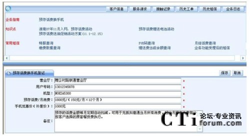 要實現(xiàn)此目的,IT支撐系統(tǒng)將高技能座席的處理能力“推送”給普通座席。第一章我們論述了IT支撐系統(tǒng)可以以客戶應用場景為核心,通過分析流程分析客戶訴求找到客戶真正的需求?梢詫⑦@一思路推演下去,針對客戶的某個具體需求,呼叫中心制定統(tǒng)一的解決方案。我們以下面的“預存話費換手機”為案例。通過先期溝通,座席已經知曉這是客戶的真正訴求,只需要選擇好“預存話費換手機”的業(yè)務類型,IT支撐系統(tǒng)會顯示出集成在一個頁面中的全套解決方案:處理此訴求可能用到知識庫中的三個知識點;需要查詢的客戶信息,經常給客戶發(fā)送的短信內容;處理此訴求可能執(zhí)行的登記任務,……