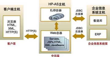 在一個(gè)開(kāi)發(fā)環(huán)境中把上述3層一般都安裝在同一臺(tái)計(jì)算機(jī)上,以便模擬3層環(huán)境。這樣,開(kāi)發(fā)者在實(shí)際環(huán)境開(kāi)發(fā)應(yīng)用之前,可以快速開(kāi)發(fā)和測(cè)試應(yīng)用。可是,在實(shí)際環(huán)境中,各個(gè)層一般位于不同的計(jì)算機(jī)上。圖2表示了HP-AS是如何采用J2EE技術(shù)實(shí)現(xiàn)分布式應(yīng)用的。