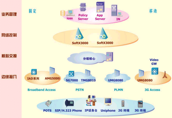 普通用戶可通過智能分組話音終端、多媒體終端接入,通過接入媒體網(wǎng)關、綜合接入設備(IAD)來滿足用戶的語音、數(shù)據(jù)和視頻業(yè)務的共存需求。