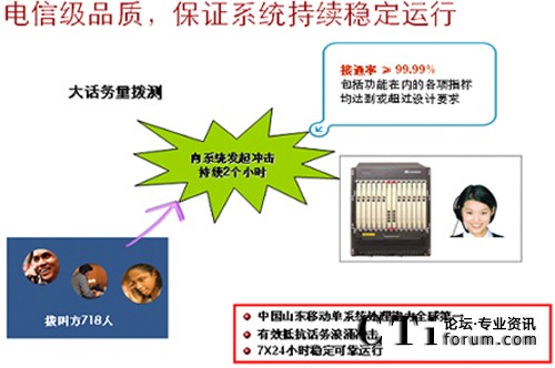 華為聯(lián)絡(luò)中心系統(tǒng)具有高穩(wěn)定性、高可靠性、易擴(kuò)展性和可維護(hù)性。這主要源于華為對(duì)電信網(wǎng)絡(luò)現(xiàn)狀與演進(jìn)的理解,源于華為擁有固定、移動(dòng)和IP三個(gè)網(wǎng)絡(luò)方面綜合實(shí)力。華為數(shù)以千計(jì)的核心平臺(tái)開發(fā)測(cè)試人員,幾十種極端環(huán)境(如超大話務(wù)量、溫差、濕度、鹽堿度、缺氧等),磨礪出的是世界級(jí)的高品質(zhì)。麥加朝圣10KM內(nèi)密集200萬移動(dòng)用戶,大部分為國際漫游,整齊劃一的用戶行為,形成連日多波話務(wù)尖峰,網(wǎng)絡(luò)受不均衡沖擊,系統(tǒng)容易雪崩。使用華為方案STC連續(xù)四年征服HAJJ期間話務(wù)高峰,告別系統(tǒng)每逢朝圣就癱瘓歷史。正是繼承了這樣的DNA,我們?cè)谀骋苿?dòng)運(yùn)營商聯(lián)絡(luò)中心系統(tǒng)單點(diǎn)實(shí)測(cè)BHCC1200K,每天平均呼叫量為600萬次,一套系統(tǒng)支撐著2000多座席和近8000路IVR。