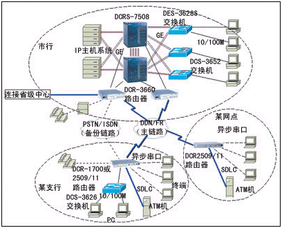 對于業(yè)務(wù)比較少的網(wǎng)點(diǎn),使用DCR-2501或DCR-2509路由器;對于業(yè)務(wù)比較多的網(wǎng)點(diǎn),使用DCR-2511或DCR-1720或DCR-1750路由器。營業(yè)網(wǎng)點(diǎn)使用DCR-2500或1700系列路由器,既實(shí)現(xiàn)柜員終端、IP業(yè)務(wù)等綜合業(yè)務(wù)接入,又能用以太口將辦公網(wǎng)絡(luò)連接起來,實(shí)現(xiàn)真正的綜合業(yè)務(wù)接入。原有遠(yuǎn)程終端可以直接連在DCR-2500或1700系列路由器上,通過IP網(wǎng)絡(luò)訪問網(wǎng)絡(luò)內(nèi)任意位置的業(yè)務(wù)前置機(jī),無須改動原有業(yè)務(wù)軟件,輕松實(shí)現(xiàn)銀行綜合業(yè)務(wù)。終端通過上述路由器可訪問支行和分行不同局域網(wǎng)上的多臺前置機(jī),訪問時,不需要調(diào)用前置機(jī)的TELNET服務(wù),且終端號固定。