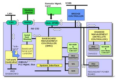 圖一為整個IPMI架構的示意圖。位于整個架構中心的部份即為我們所謂的Baseboard Management Controller (BMC)。它通過各別的界面來管理整個系統(tǒng),如系統(tǒng)狀態(tài)偵測及事件過濾、電源管理、記錄事件發(fā)生時間及系統(tǒng)回復控制,并且透過網絡或串行端口來告知管理人員,另外,它提供了IPMB的總線來和外部的管理控制器互相溝通。