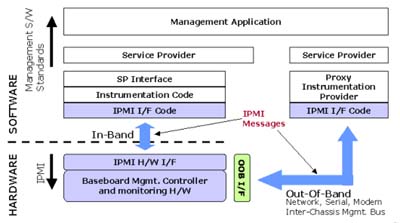 • 管理軟件:系統(tǒng)管理者最常接觸的就是上層的管理軟件,簡單的類型就是使用一般的終端機(Terminal)程序來接收從Serial/Modem所傳送過來的文字訊息。近年來,除了BMC廠商會有自行開發(fā)的上層管理軟件外,也有不少的軟件廠商加入了開發(fā)管理軟件的行列,而他們最主要利用的溝通界面即為網絡界面。不管是通過序列或是網絡,在界面上傳輸?shù)亩际荁MC所能辨認的IPMI訊息。