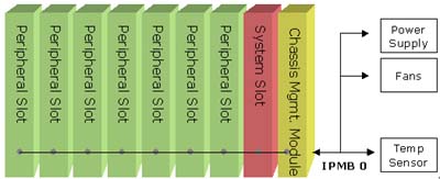 • 標準型IPMI系統(tǒng):利用背板上的IPMB總線,在系統(tǒng)槽上的CompactPCI單板上設計一顆BMC的控制器,其余在PCI插槽上的外圍片只要存在簡單的IPMI命令兼容的控制器,系統(tǒng)槽的單板即可透過IPMB讀取所有外圍片的狀態(tài),然后再經由序列或是網絡的形式通知系統(tǒng)管理者。