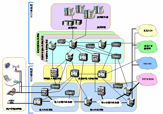 NGN是基于分組技術和多層網絡結構的未來電信網絡。它可支持所有可能的業(yè)務,包括使用各種媒體類型和轉播方式的、具有不同性能要求的業(yè)務。它的業(yè)務與傳送分離、控制與用戶數據處理分離的構架允許網絡中各個部件可分別配備和獨立發(fā)展。業(yè)務的提供采用具有開放接口的業(yè)務平臺,可以為第三方業(yè)務提供者所使用。傳送層采用可支持不同帶寬和端到端QoS能力的技術。NGN控制功能可分布于現有和新的網絡基礎設施上并可按組網的要求采用不同的組合形式。網關提供NGN不同域之間或NGN和現有網絡之間的互通。NGN支持通用移動性,使用戶或其他移動體無論其位置或技術環(huán)境的變化都能進行通信和接入業(yè)務。它允許用戶可以跨越不同的有線或無線接入技術,跨越現有網絡的界限使用他們的業(yè)務。| AGC Access Gateway Controller AMC Access Management Controller AMG Access Media Gateway AS Application Server BGC Breakout Gateway Controller MAG Multimedia Access Gateway MGC Media Gateway Control Function MGW Media Gateway MMS Mobility Management Subsystem MRC Multimedia Resource Controller MRP Multimedia Resource Processor NAAS Network Access Attachment Subsystem |