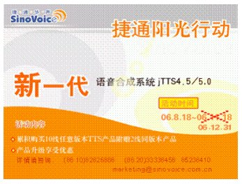 2006年8月18日,捷通華聲正式發(fā)布新一代語音合成系統(tǒng)jTTS4.5,同時啟動了為期三個月的“陽光行動”。行動一經(jīng)推出,立即引起了強烈的市場反響。每日致電(86-10)82826886咨詢jTTS4.5產(chǎn)品及價格詳情的客戶接連不斷,通過訪問捷通華聲語音合成在線演示系統(tǒng)http://www.sinovoice.com.cn/2-e-1.asp或者撥打24小時產(chǎn)品演示熱線(86-10)82826886-8624體驗合成效果自然度和流暢度的用戶絡繹不絕,定購產(chǎn)品享受累積購買10線任意版本TTS附贈2線同版本產(chǎn)品等優(yōu)惠政策的合作伙伴更是紛至沓來。大家都對jTTS4.5的新增甜美音色大加贊賞,更對jTTS4.5合成效果自然度和流暢度的提升給予了極大的肯定及滿意,同時表達出希望能延長活動時間的誠懇建議。為答謝新老客戶對捷通產(chǎn)品的關(guān)注與厚愛,捷通公司特決定將“陽光行動”活動時間延期至12月31日。