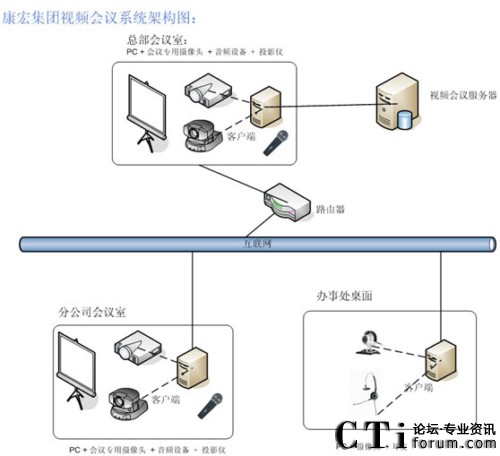 康宏集團(tuán)總部擁有100M光纖接入,每個(gè)分公司擁有10M光纖接入,每個(gè)辦事處為1M或2M ADSL接入。V2 Conference視頻會議系統(tǒng)以康宏集團(tuán)目前的網(wǎng)絡(luò)為基礎(chǔ),部署和實(shí)施該多媒體會議系統(tǒng),實(shí)現(xiàn)一個(gè)可進(jìn)行音頻、視頻和數(shù)據(jù)的多方位交互平臺。