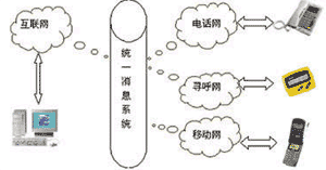 UMS可以將電子郵件、語音、尋呼、移動短消息、傳真和多媒體數(shù)據(jù)等所有信息類型集合為一個信息,并可用電話、傳真、手機、呼機、PC、掌上電腦、PDA等通信設備中的任何一種接收,在有線、無線、互聯(lián)網(wǎng)之間架構起一個信息互聯(lián)通道(如圖)。統(tǒng)一信息系統(tǒng)(Unified