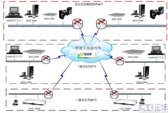 接入層:以視頻終端為主,包括總行、一級分行、總行直屬機構(gòu)共51臺POLYCOM HDX 8000高清視頻終端,全國二級分行共297個POLYCOM