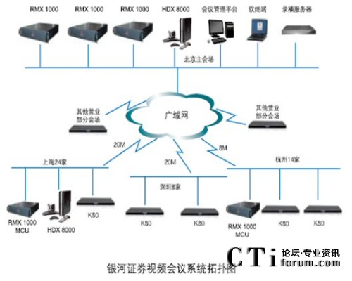 銀河證券視頻會議系統(tǒng)采用寶利通視頻會議產品,在銀河證券北京總部中心機房配備寶利通新一代實時媒體會議平臺 RMX 1000 MCU和高清錄播服務器;在上海和杭州也分別配置了RMX